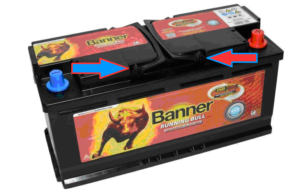 - Демонтаж АКБ. Устройство вынимают из моторного отсека. С верхней части корпуса удаляют заглушки. Замеряют плотность кислотного раствора, используя ареометр.