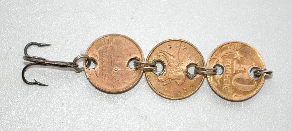 Интересный способ изготовления, особенно если у вас дома накопилось много мелочи. Однако, прежде чем приступать к созданию приманки, нужно решить – сколько монет вы будете использовать. Их количество влияет не только на вест приманки, но и на ее форму. К примеру, вы можете использовать три монеты в ряд одним номиналом. А можете использовать в хвосте – копейку, посередине – 10 копеек, и у головы – рубль. В качестве примера разберем самый стандартный вариант изготовления такой приманки – три монеты одним номиналом.