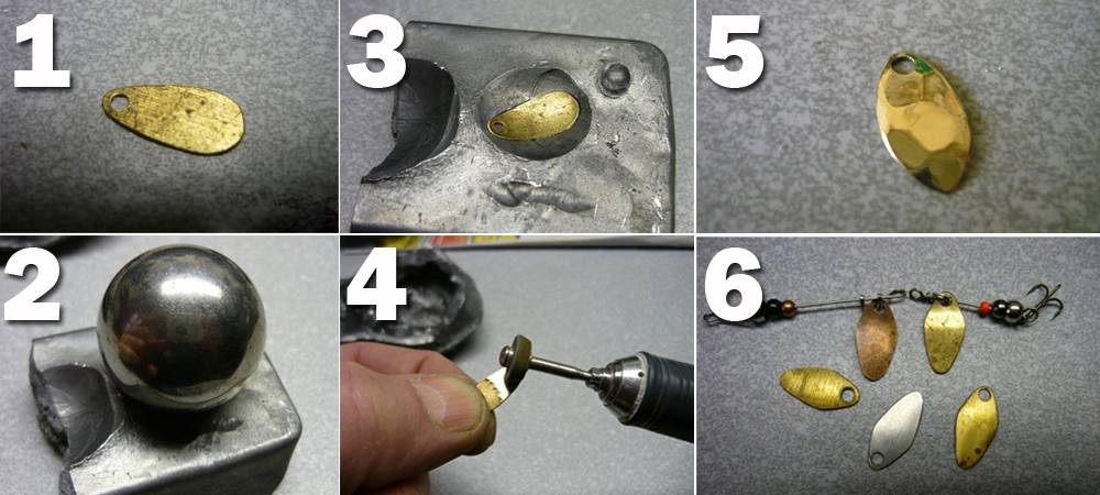 Кроме использования ложки, колебалку можно изготовить из кусочка плоского металла, стальной жести, медного или алюминиевого листа, выдавив или отчеканив форму с последующей обработкой кромок. Для огрузки такого вида самоделок методом напайки или наклёпа вогнутость заготовки заполняют требуемыми весами оловянным и свинцовым сплавом, а также медной или латунной пластинной. Ширину хода уже готового ловчего инструмента настраивают подгибом кромок. Чем глубже вогнутость, тем ход колебалки размашистей и шире.