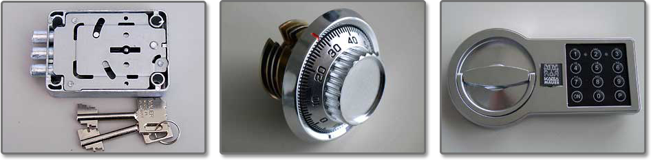На охотничьих сейфах или шкафах устанавливаются современные замки различных типов, которые надёжно сохраняют содержимое этих самых сейфов или шкафов.1. Сувальдные замки: – вполне надёжны, имеют сложную личинку и ригель который отпирает сам замок, поэтому их невозможно открыть без ключа, который ставит набор пластин (сувальду) в определённое положение, при котором поворотом ручки и отпирается замок. Как правило, современные модели охотничьих сейфов могут снабжаться двумя замками разного типа.2. Механические кодовые замки: – это классические сейфовые замки, которые путем набора комбинации цифр отпирают замок. Механические кодовые замки очень удобны и надёжны: не зная кода их просто невозможно вскрыть.3. Кодовые электронные замки: – очень удобны в использовании, имеют множество преимуществ, как например не надо постоянно носить с собой ключ, достаточно знать определённую комбинацию цифр, которую можно установить самому.4. Биометрические замки: – Это электронные замки со сложным, но вполне надёжным механизмом распознавания по отпечатку пальца. Биометрические электронные замки могут быть настроены на несколько отпечатков пальцев, что позволяет увеличить его надёжность. Все электронные сейфовые замки оснащены автономным источником питания, что только лишь улучшает комфорт от пользования ими.