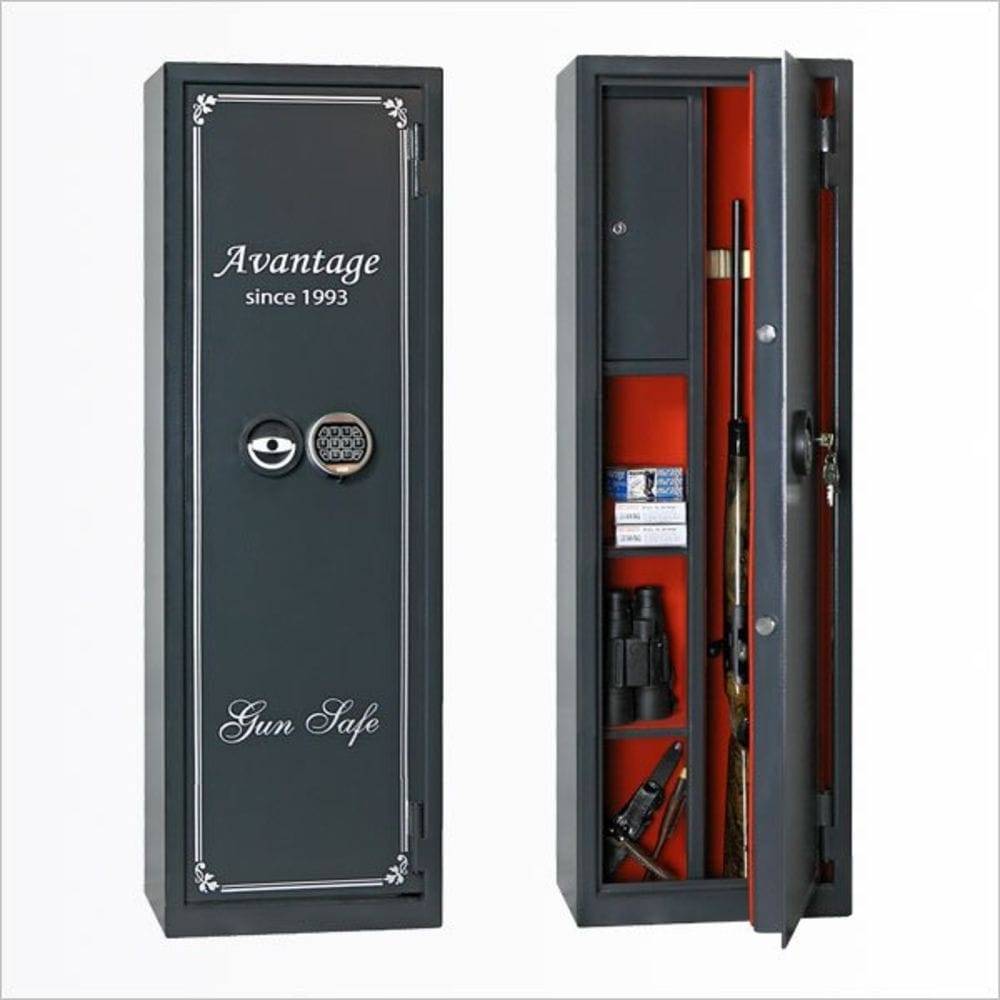 4. Охотничий сейф Авантаж 420Es. Изготовитель: ONIX (Китай); габариты: 1310х420х250 мм., вес: 100 кг., толщина стенок 45 мм., толщина двери 60 мм. Два замка: ключевой и электронный. Имеется внутреннее запираемое отделение, съёмные полки, есть возможность их перестановки, оборудован держателями ружей. Охотничий сейф Авантаж 420Es рассчитан на хранение 3 стволов ружей. Ориентировочная стоимость 55000 рублей. Гарантия 5 лет. Достаточно дорогая, но при этом качественная и современная модель, с повышенной взломо- устойчивостью.