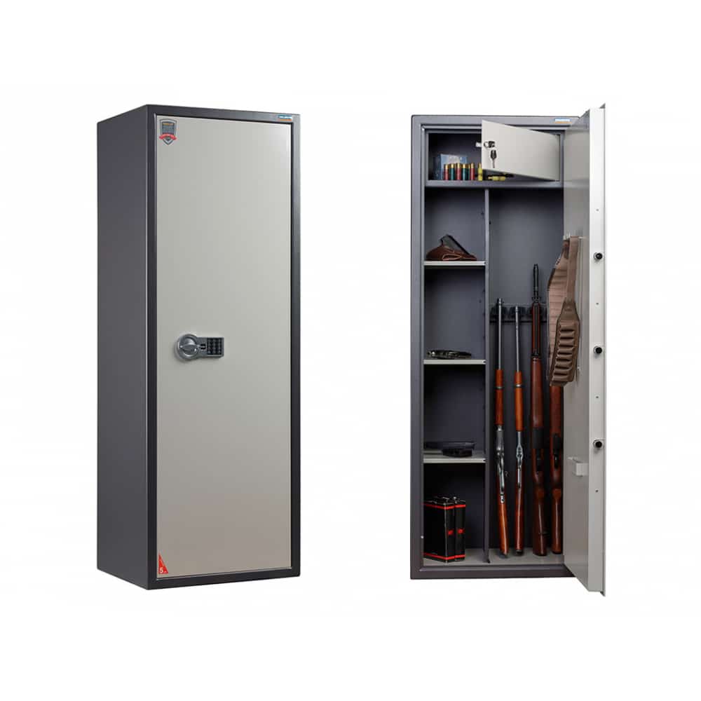 Масса шкафа достигает 136 кг. Это сейф 1 класса защиты от взлома, имеющий стенки толщиной 25-30 мм. Кодовый шестиригельный замок обеспечивает надежную защиту от кражи. Подходит для хранения нарезного оружия.