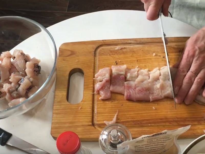 Филе рыбы залить лимонным соком и оставить на 20 минут. Лимон способствует удалению запаха тины, а мякоть становится более плотной. Только после этого щуку разрезать на кусочки.