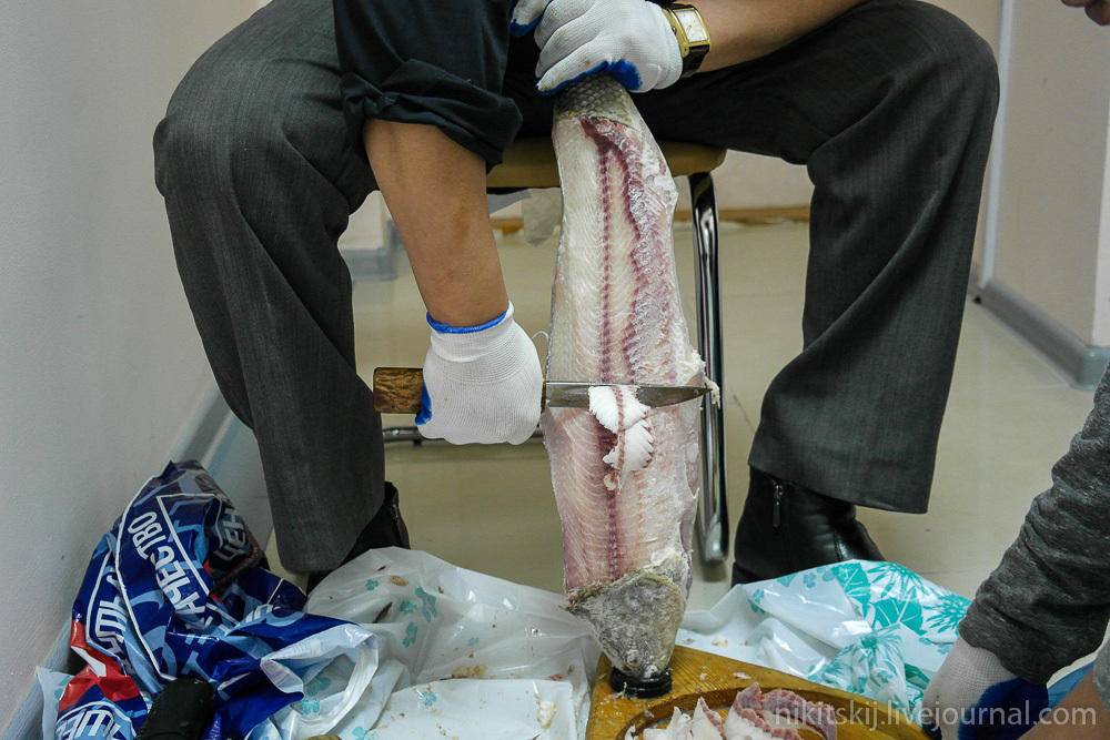 - У немного подтаявшей рыбы вытаскивают визигу.