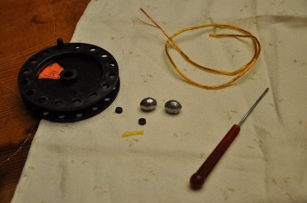К данным материалам прикрепляется леска одним концом. Наматывается так, чтобы легко при необходимости сходила с основы. К другому концу подсоединяется скользящее грузило, также тройник и поводок.
