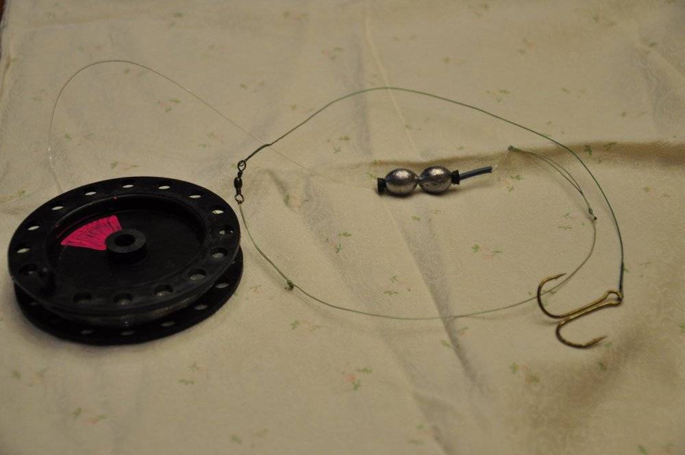 На поводок с помощью карабинчика крепится тройник. Размер № 6–12, в зависимости от размера щуки, которая водится в водоеме. Вверху, сразу за поводком, закреплен грузик, он служит как ограничитель для основного подвижного грузила. Вес 25 г. Длина основного проводника зависит от глубины водоема, минимальный размер 8 м.