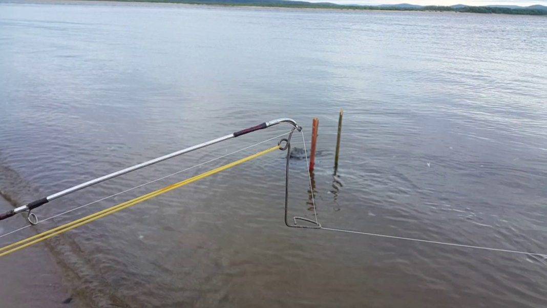 Принцип работы такой. Забрасываем снасть в воду, настораживаем и фиксируем подсекатель, продеваем леску в крючок.