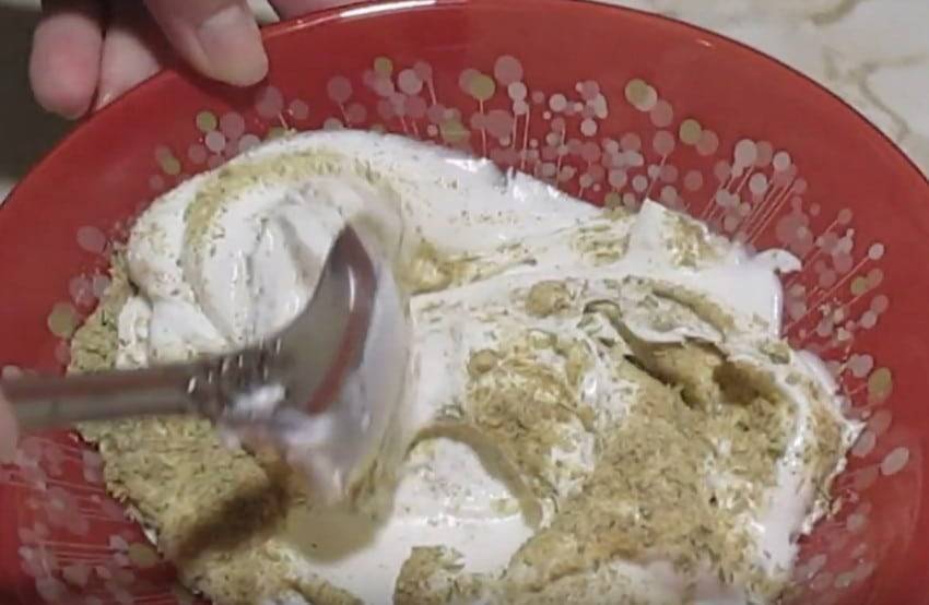 - Через специальный пресс выдавить пару зубчиков чеснока, добавить соли и перца, свежую измельченную зелень по вкусу, специи и приправы.