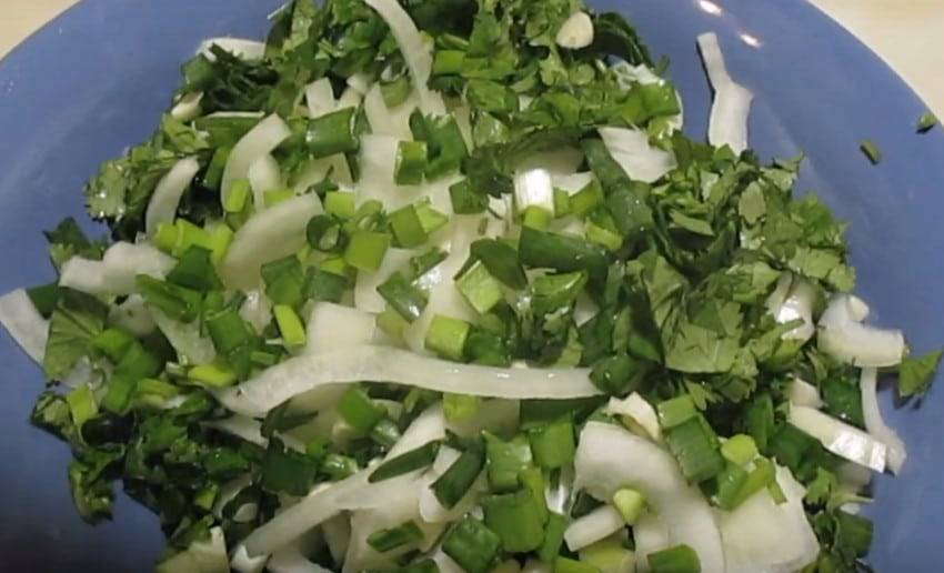- Все овощи и зелень очень мелко нарезать или прокрутить через мясорубку. Добавить специи и свежую зелень.