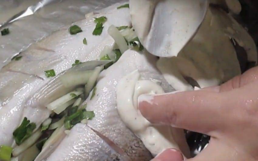- Перемешать и натереть рыбу этой смесью. Если тушка целая, кусочки лимона, лука и травы можно вложить в брюшко рыбы.