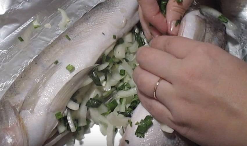 - Репчатый лук очистить от шелухи и нарезать толстыми колечками, не разбирая их положить внутрь брюшка. Туда же для пикантности добавить кружочки лимона или лайма.