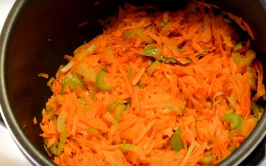 - На сковороду или в казан влейте масло, на него положите слоями половину овощей. Первым слоем желательно положить морковь, вторым – свеклу, третьим – лук.