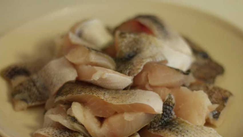 Согласно рецепту, сначала нужно вымыть рыбу, удалить плавники ножом. Нужно немного отступать от начала плавников для того, чтобы мясо оставалось целостным. Избавиться от требухи, чешуи, глаз и жабр. Нарезать судак крупными кусками.