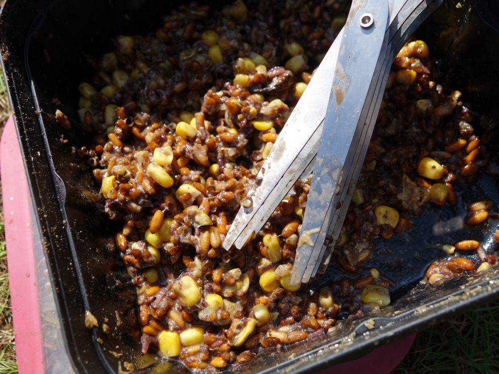 Летом же до 50 % состава смеси нужно отвести под крупную кормовую фракцию – пшено, перловка, кукуруза, черви. Серебристого обжору летом нужно пригласить к столу, а на крючке фидера подсовывать более соблазнительную приманку, чем в прикормке, но похожую по цвету, составу и запаху. К примеру, можно выделить ее на основном фоне дипом или аттрактантом.