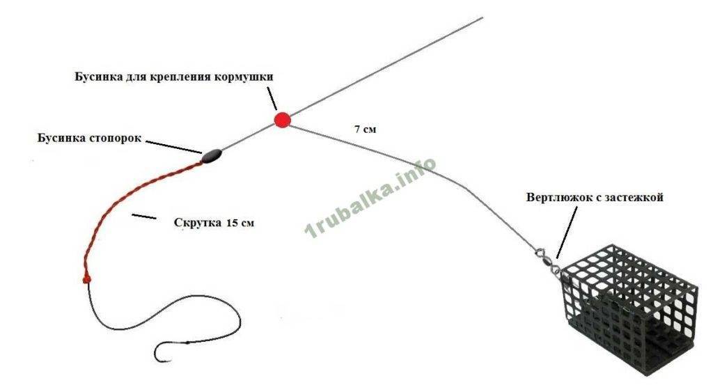 В принципе можно сразу кормушку крепить на леску. Но для карпа, как впрочем и любой другой рыбы, лучше иметь небольшой отвод, длинною 5-25 см, который даст нам «эффект патерностера». У нас будет небольшое плечо, которое еще более нивелирует тяжесть кормушки при поклевке. Длинный отвод 15-25 см, необходим в случаи ловли на сильно заиленном водоеме или в местах с высокорастущей травой.