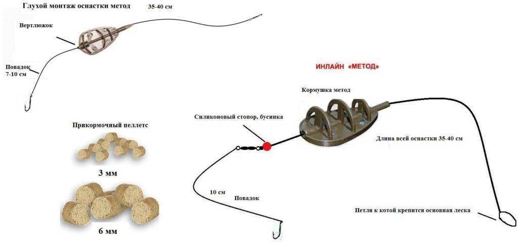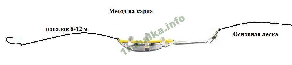 При ловле карпа с применением кормушек типа «Метод» и подобными им используется оснастка инлайн. Леска пропускается сквозь тело кормушки, затем стопорится силиконовыми бусинами. Внизу привязывается вертлюжок, к которому крепится недлинный, в 5-8 сантиметров, поводок.