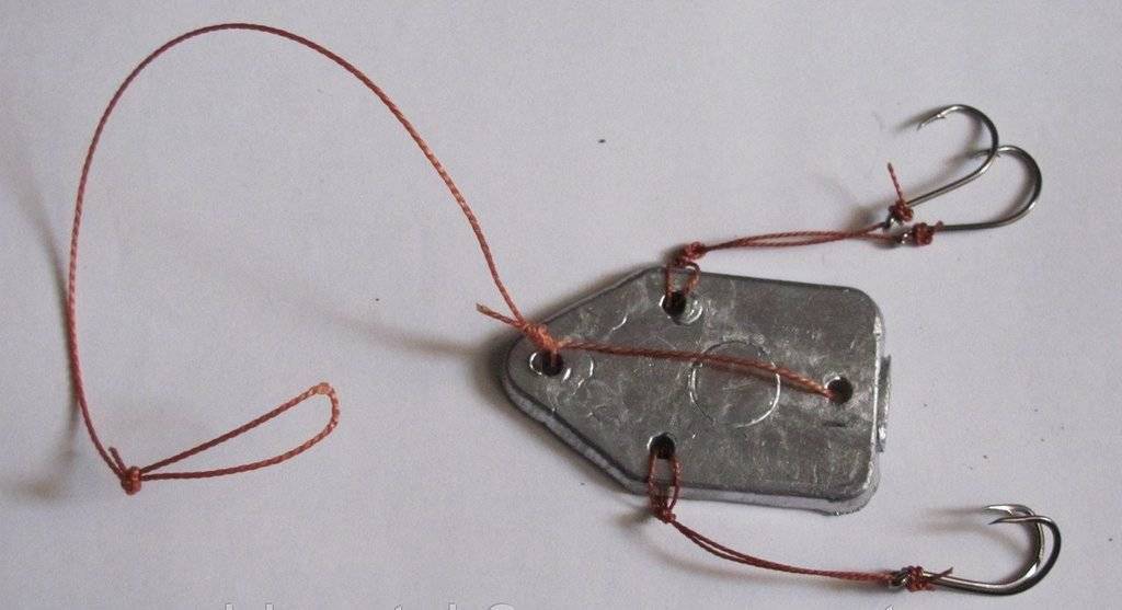 - Самый распространённый тип снасти, собранный на основе плоского куска свинца в виде квадрата с упорным бортиком, который позволит защитить макуху от разрушения при столкновении с преградой на дне. А также обеспечит аквапланирование за счёт своей формы, при подтяжке груз не будет зарываться в дно, а наоборот станет подниматься над ним. Макуха крепится к основе самозатягивающейся петлёй и резиновым кольцом, обведённым вокруг. Крючки заводятся в просверленные отверстия в макухе.