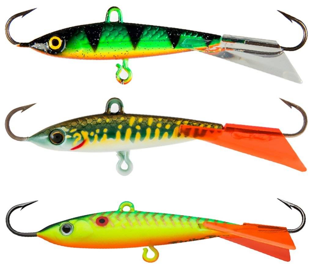 Приманка для зимней рыбалки, очень хорошо показала себя в ловле щуки. В наименовании этой модели достаточно много цветовых вариантов, с набором стандартных расцветок и более. У балансира два крючка по одному спереди и сзади, а также посередине на брюшке тройничок, такой набор сократит процент схода рыбы к минимуму. Заглубляется на любую глубину, играет довольно привлекательно.