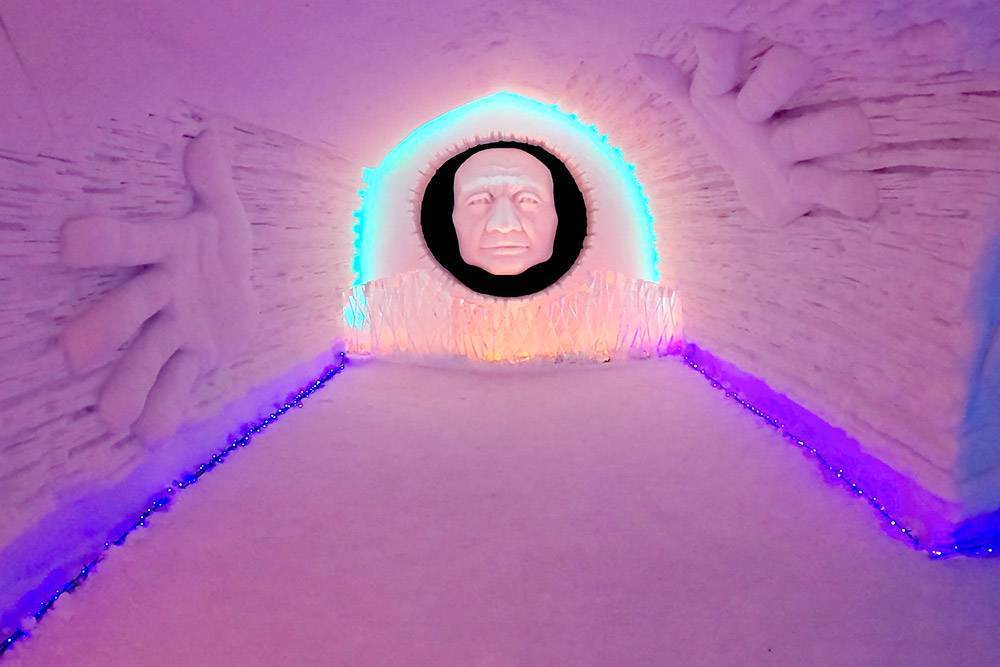 У стен деревни тоже стоят снежные и ледяные скульптуры, их можно посмотреть бесплатно. Там много ледяных статуй ледокола, фигуры людей. Меня больше всего впечатлил ледяной бар.
