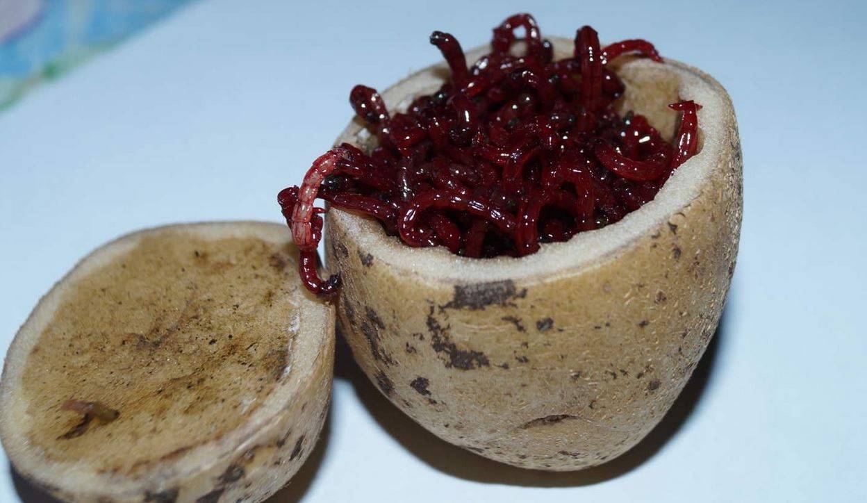 - Вкладывают в срез ручки несколько личинок мотыля.
