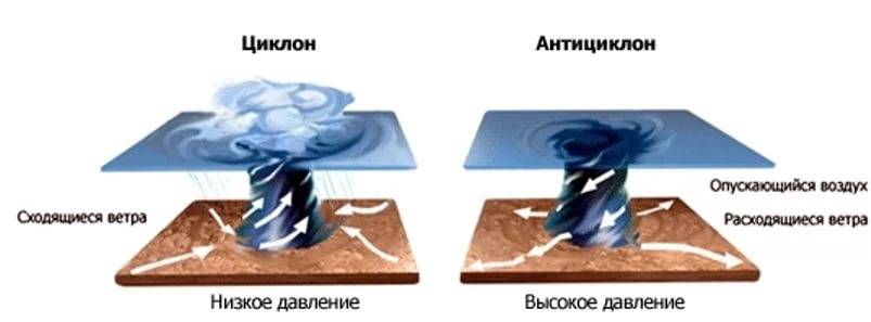 Постоянная смена циклонов и антициклонов, их взаимодействие сказываются на атмосферном фронте, давлении, силе ветра… Например, приближающийся с запада антициклон, сулит северным ветром, а при его смещении с запада на восток, ветер ослабевает, а давление растет.
