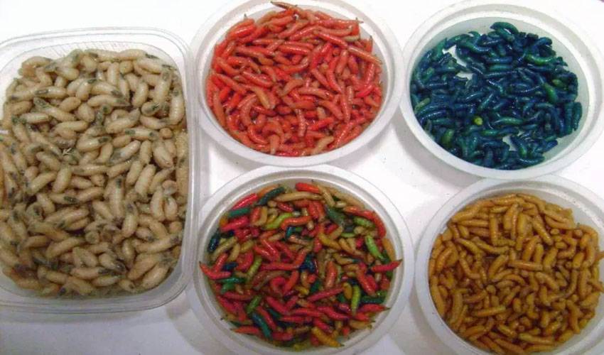 Сделать так, чтобы личинки получили определенный окрас еще на этапе роста, можно, если кормить их пищей определенного цвета. Например, использование для их подкормки творога приводит к изменению цвета в белую сторону, а отварной яичный желток в рационе опарышей сделает их окрас золотистым.