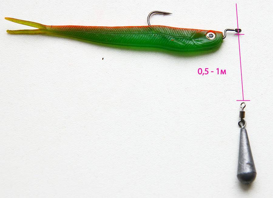 Его длина зависит от того, на какой глубине предполагается ловить. Как правило, достаточно 30, в крайнем случае — 50 см. Само грузило ставится достаточно тяжелое, минимум двадцать грамм.