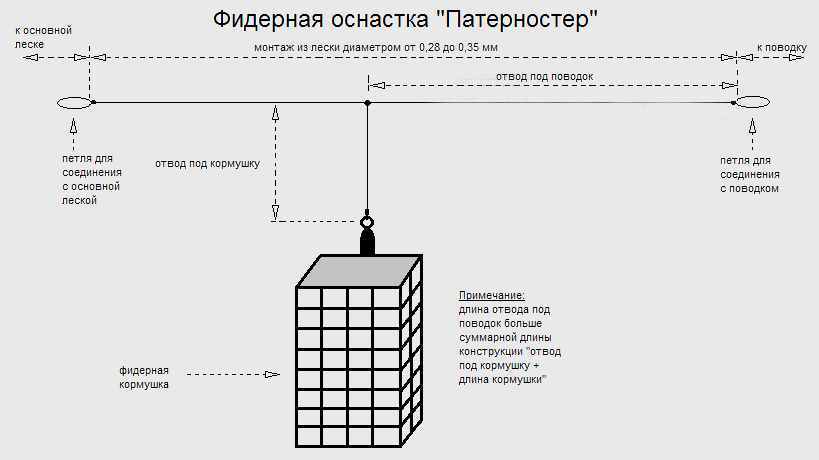 Обычно петля патерностера имеет диаметр 10-15 см. Такой размер позволяет стандартной кормушке не запутываться и не цепляться за снасть.