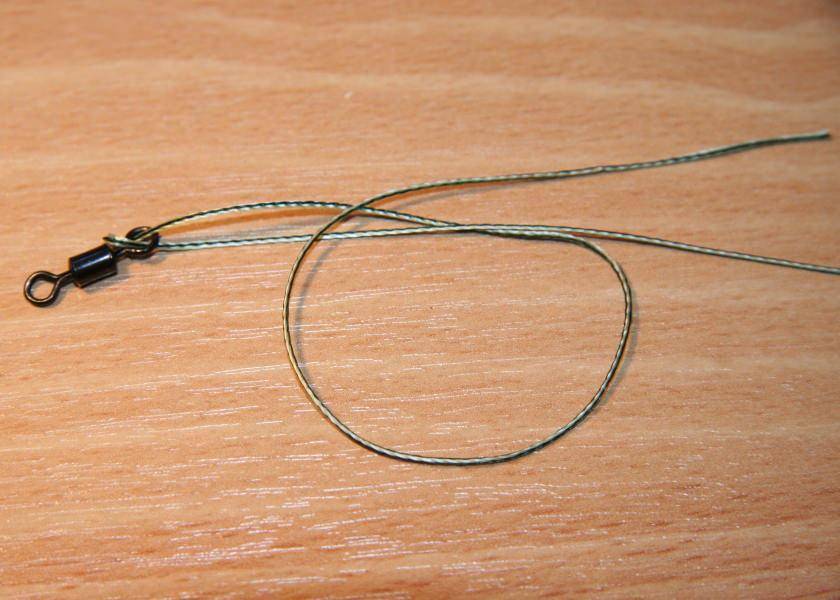 - для начала стоит пропустить свободный отрезок лески сквозь ушко вертлюжка на поводке;
