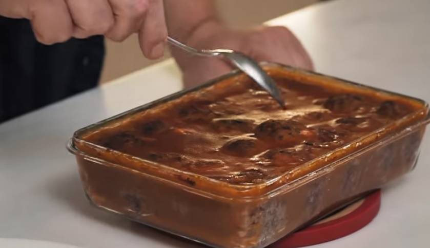 Готовую заливку Константин пропустил сквозь сито, отделив от нее кусочки овощей. Эту массу он вылил на вынутые из духовки тефтели сверху. Добиваться того, чтобы соус полностью пролился на дно формы, Ивлев не советует.