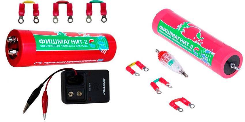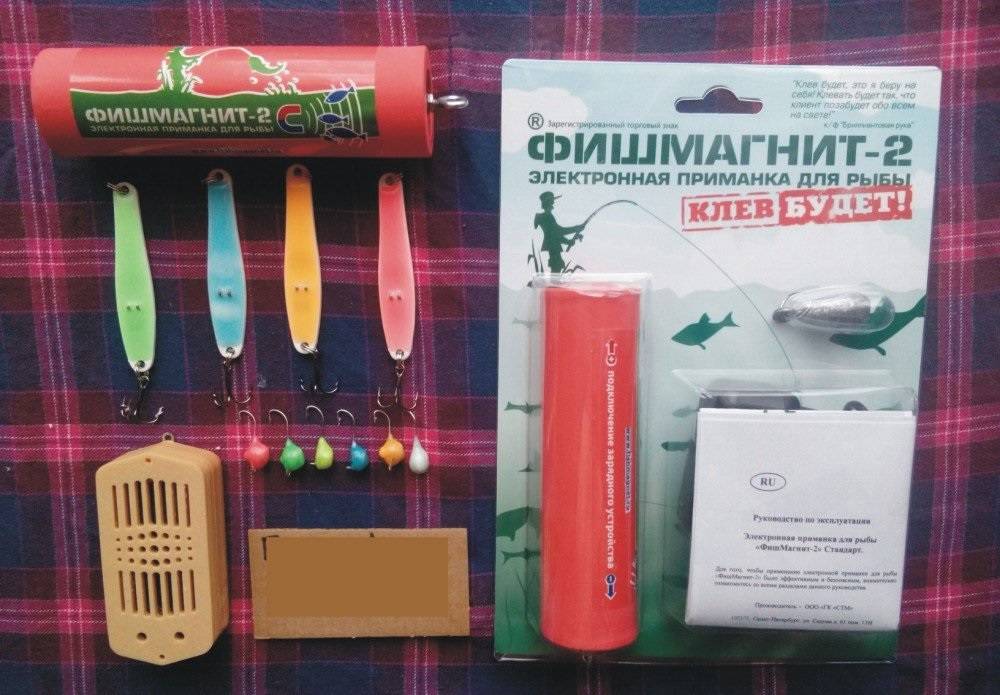 СТМ Фишмагнит-2 Люкс. Устройство издает световые, звуковые, вибрационные сигналы для привлечения добычи в радиусе до 1000 м. В комплект входит 3 прямые перемычки, контролирующие интенсивность сигнала при сильном или слабом течении. Воблер действует на глубине и на поверхности водоема. С успехом можно использовать в жару и зимние месяцы.