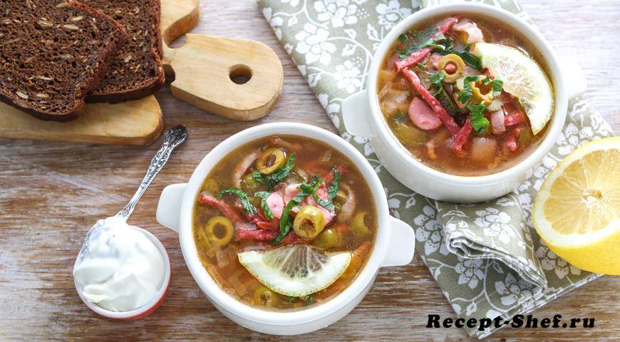 Приготовление солянки завершается в тарелке: добавляют оливки, маслины, нарезанные кусочками, и дольку лимона. Заправляют суп сметаной, однако этот момент вызывает много споров, поэтому лучше ориентироваться на свой вкус.