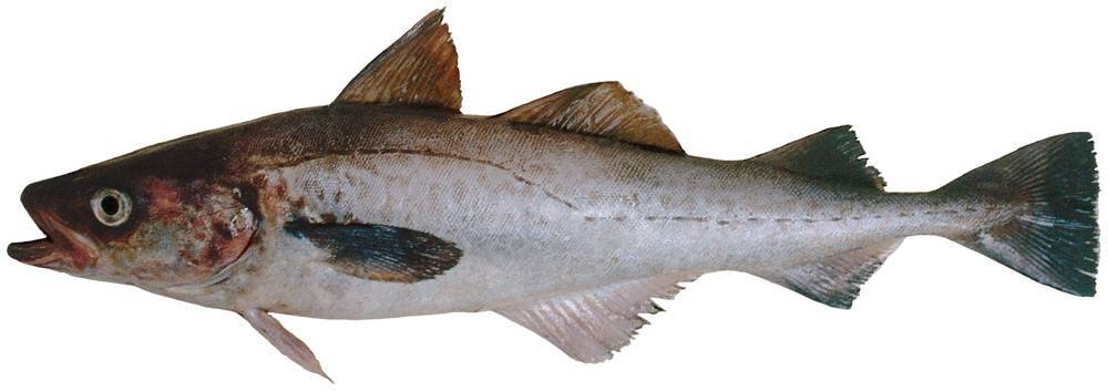 Это самый дешевый тресковый вид рыбы с нежным диетическим мясом без жира. Хищных рыб легко отличить на прилавке магазина. Их особенность – заостренная голова, которая имеет темный окрас. Спина окрашена в оливковый цвет плавно переходящий в желтоватый на боках. Брюшко имеет беловатый цвет.Вылавливают рыбу круглый год, значительную часть добычи привозят из северных краев.