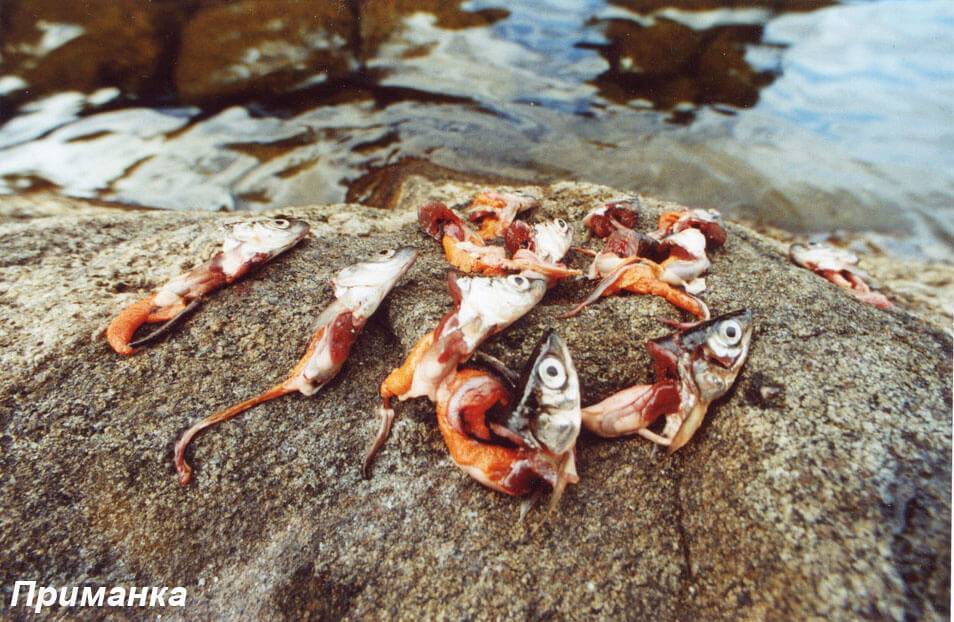 Кусочек рыбьего мяса. Как мы уже говорили – налим идет по запаху. Да, раненая рыбка пахнет привлекательно, но куда более привлекательнее – кусочек мяса. Однако не забывайте, что живец, пусть и раненый, может больше суток привлекать налима, тогда как кусочек мяса – не более одной ночи.