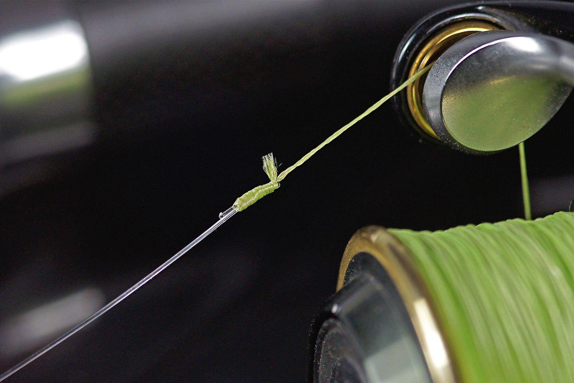 Самый распространенный метод. Очень прочный вид узла, стоит только правильно его связать. Нужны будут два куска лески. Можно взять плетенку и монофилку.