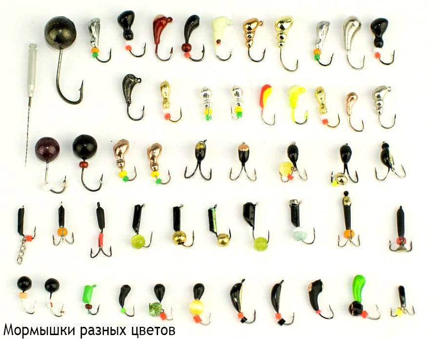 Зимние мормышки имеют небольшие размеры. Окрашивают их так, чтобы рыба видела издалека. Также их снабжают разными насадками.