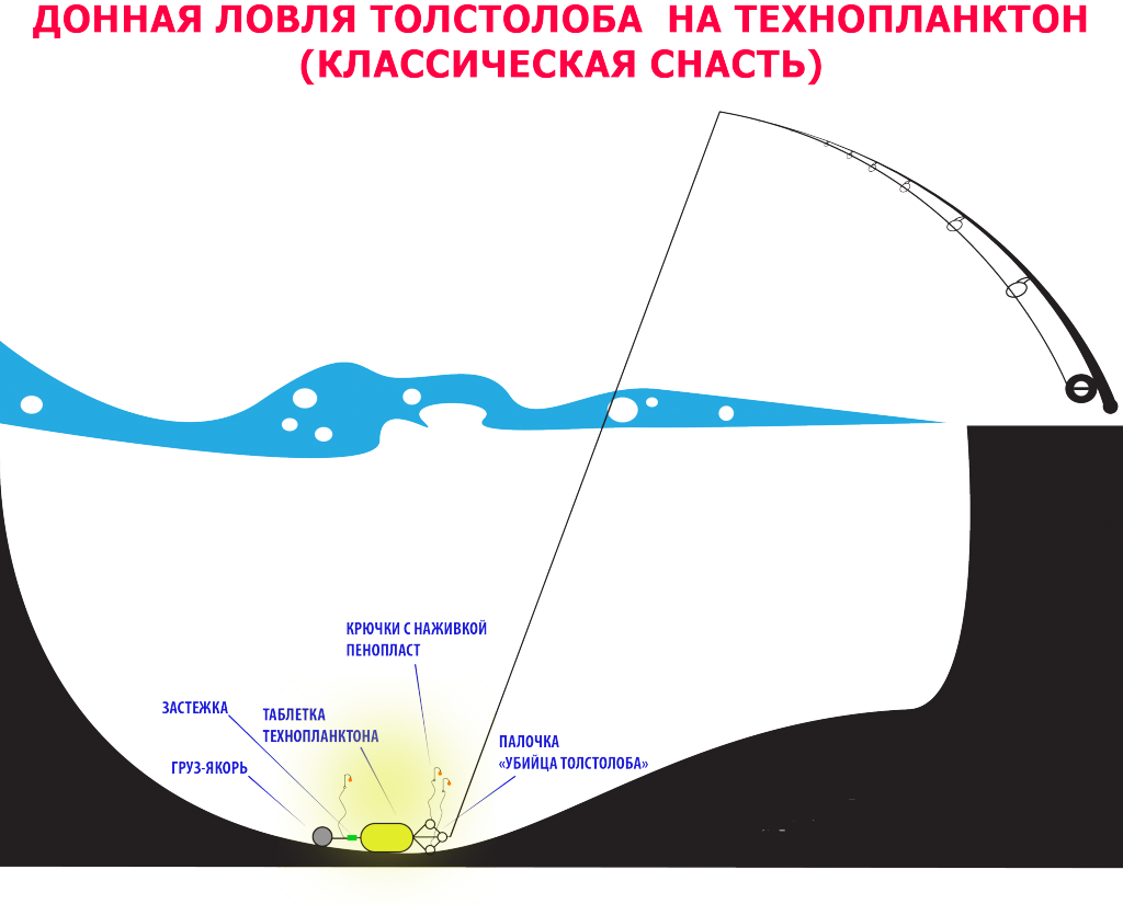 Снасть для донной ловли не отличается особенно сложной структурой. Как правило, берется крепкое удилище, потому что толстолобик – рыба сильная и задача рыболова – ее вытащить. Основная составляющая такой снасти – это грузило.