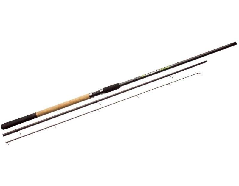 Мощная снасть предназначена для дальнего заброса в водоемах со средним, быстрым течением. Фидер длиной 4,3 м изготовлен из прочного композита. Штекерная конструкция также предполагает наличие 3 секций с 15 кольцами из анодированной стали и алюминиевыми вставками. Величина теста предполагает использование кормушек весом до 150 г, что обеспечивает вылов трофейной добычи. Выдерживает интенсивные атаки крупной рыбы без потери чувствительности.