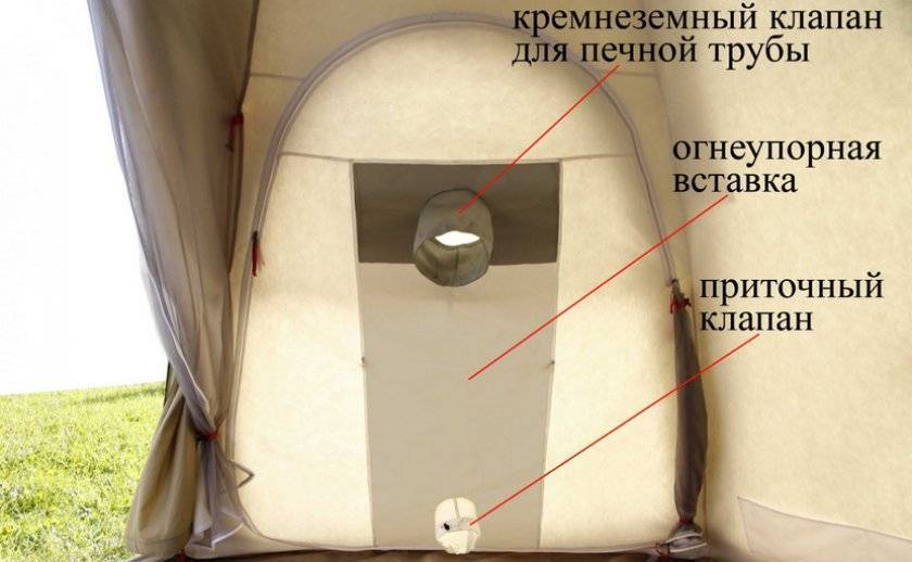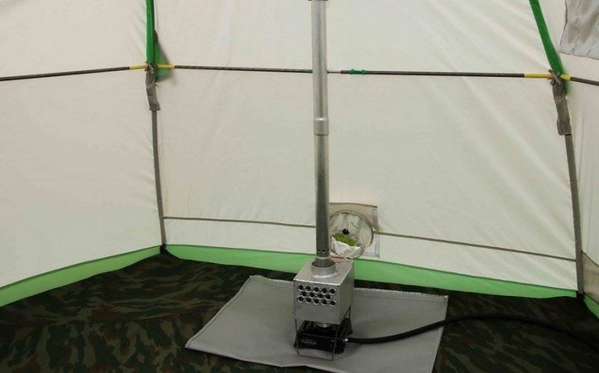 Любая палатка имеет отверстие для горячей дымовой трубы (дымоход). Кроме того, место вокруг печи всегда защищают огнеупорным ковриком на случай вылета горячих углей. Некоторые производители палаток рекомендуют откатить основание палатки и поставить изделие прямо на землю.