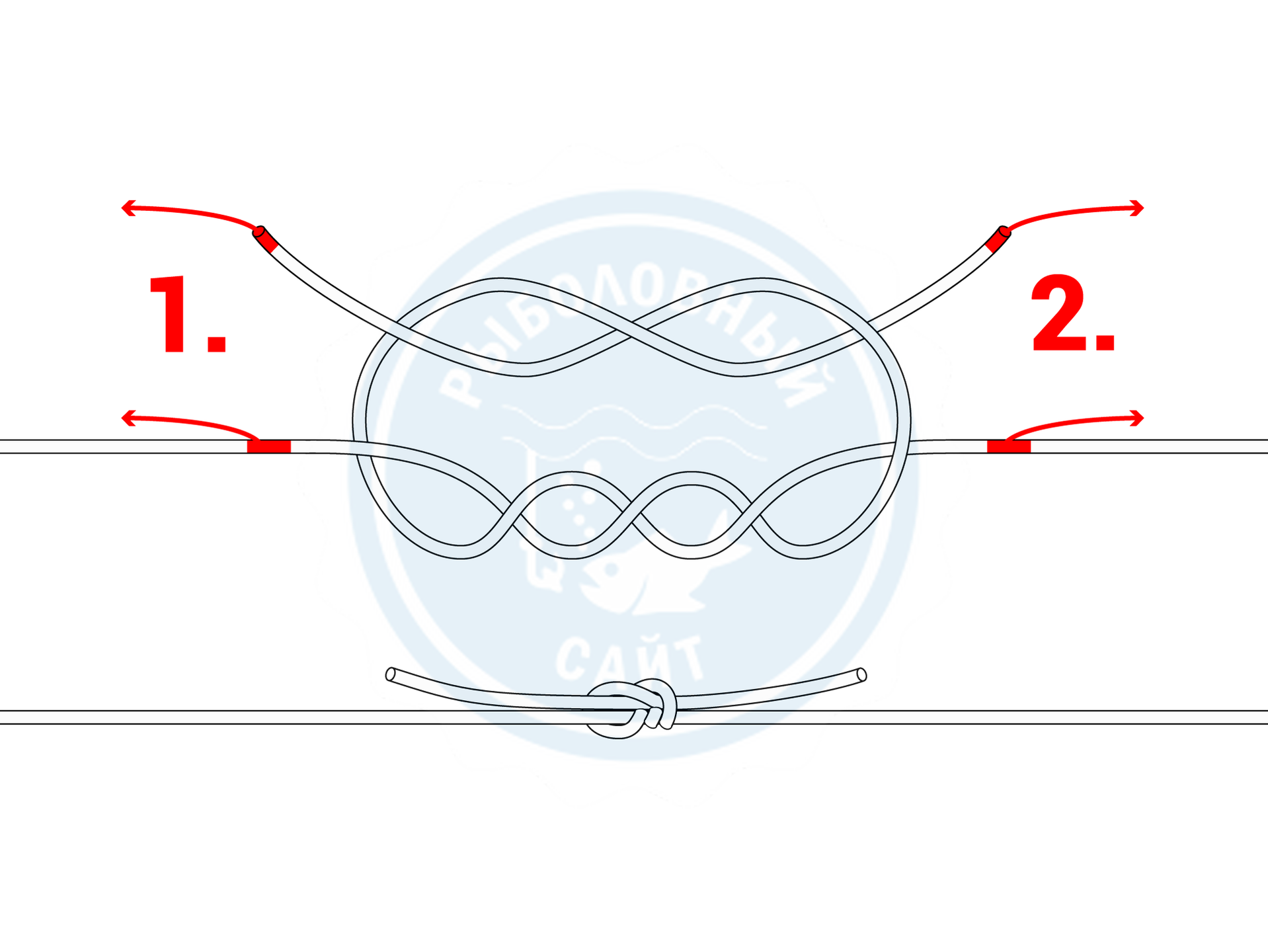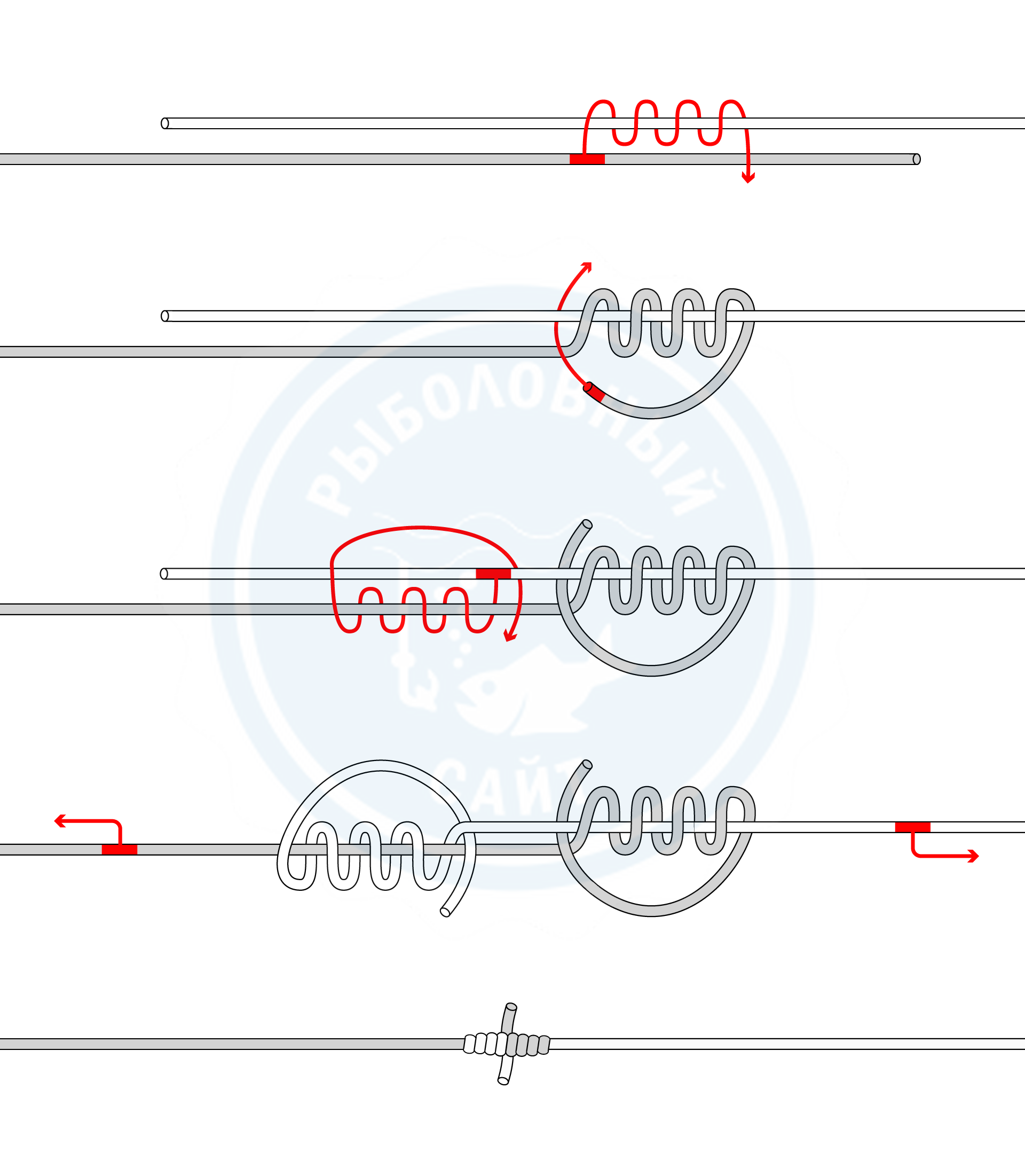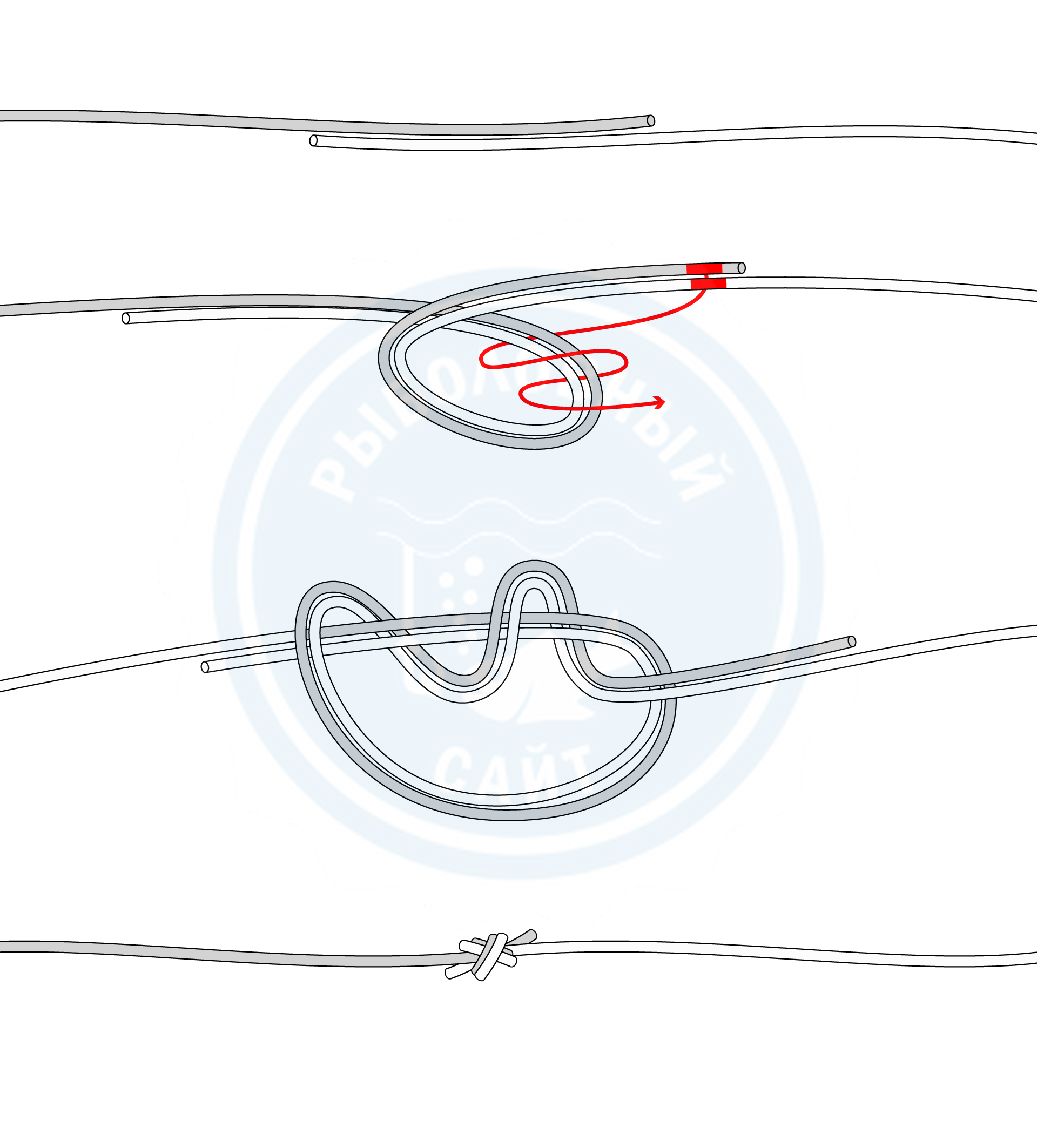 Техника вязания «кровавого» узла для лески и плетенки предусматривает выполнение следующих действий.