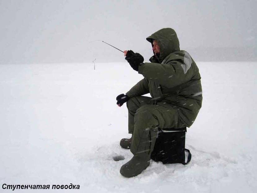 - Ступенчатая проводка — приманку опускают в лунку по метру, останавливая на 3—4 секунды.