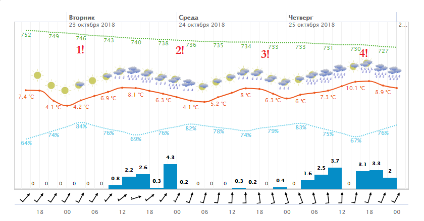 - Под 1! высокая влажность и медленный спад давления. Да, он будет везде на этом графике, так как это октябрь, и давление будет падать так или иначе. Но именно именно под цифрой 1! высокая влажность без дождя, что идеально для ловли, особенно щуки.