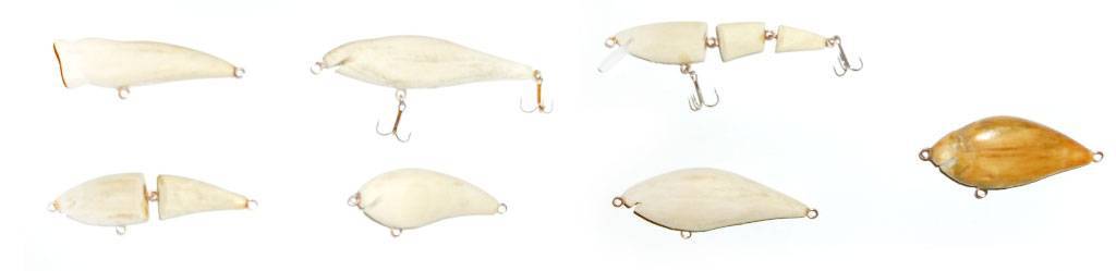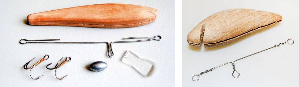 Тут требуется добиться не только симметрии, но и установить внутри воблера какие-то системы, в роде шариковых погремушек. По этой причине подобные приманки делают из двух половинок. Их либо тщательно изготавливают вручную, либо отливают из пластика или пенопласта в формах. За основу для формы берут готовый фирменный воблер. Установив внутренние системы, проволочный каркас и грузила, половинки склеивают. Затем приманку окрашивают.