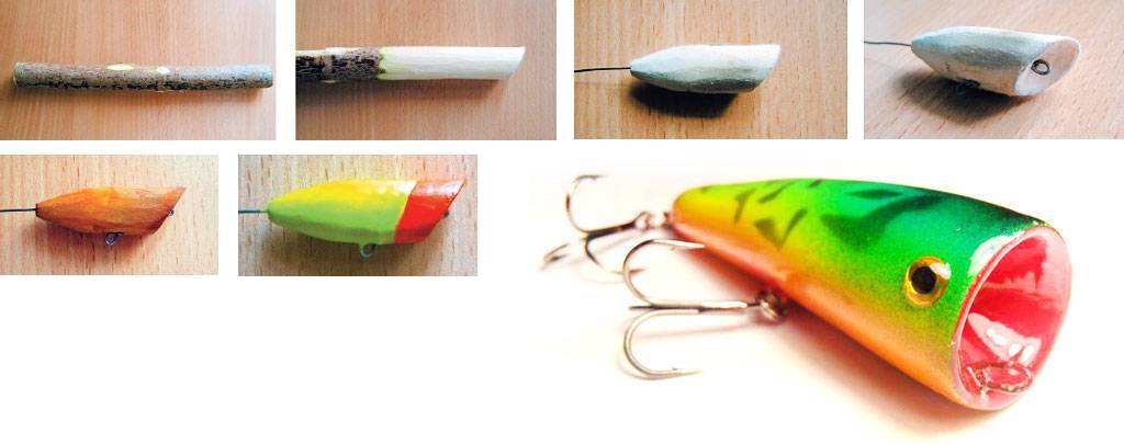 Довольно просто можно изготовить самодельные объемные приманки для ловли с поверхности водоема: попперы или волкеры.