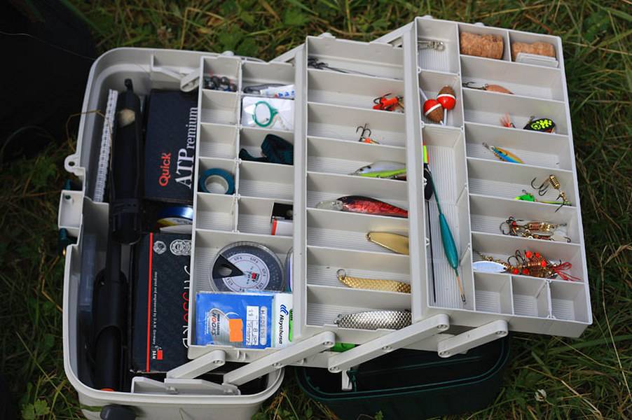 - коробка для снастей, с отделениями для блёсен и поплавков, сигнализаторов и лески, крючков и других полезных приспособлений;