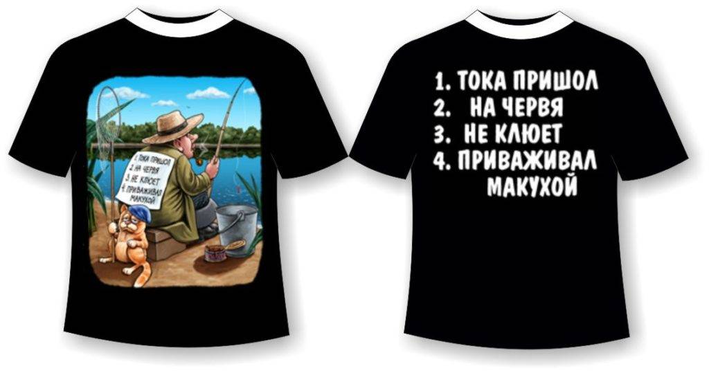 Надпись на футболке следует подбирать в зависимости от индивидуальных предпочтений. Чаще всего можно встретить футболки с тематически-юмористическими высказываниями, связанными с рыбной ловлей.