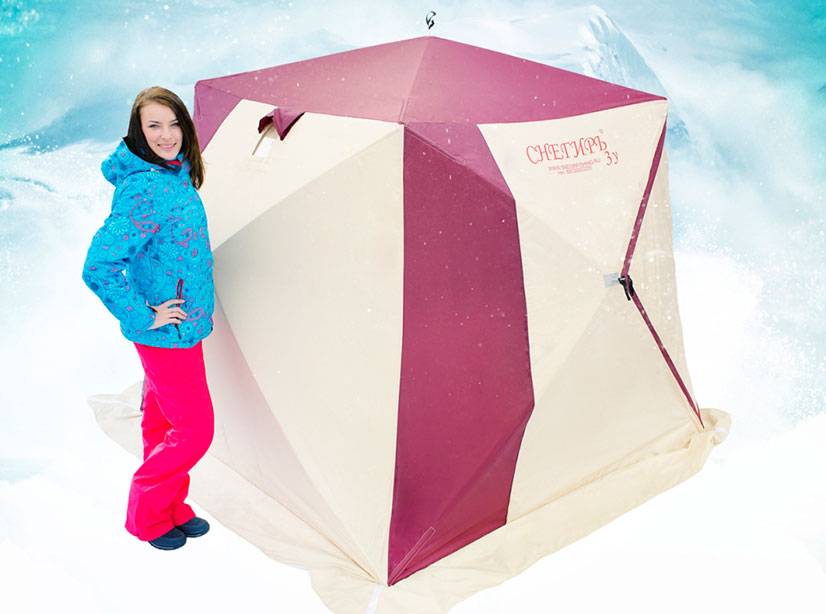 - Кубические — утепленные трех- и двухслойные полые модели, которые можно собрать за 2−3 минуты. Прочно закрепляются на льду, позволяют передвигаться в полный рост, обеспечивают уютную и теплую атмосферу.